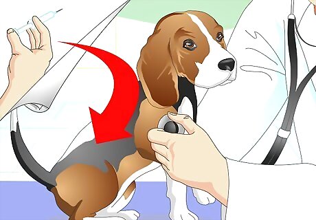 Take him (or her) for checkups. To make sure your beagle stays healthy, make sure you take him to the vet regularly. At eight weeks, take your beagle to the vet to check his overall health as well as him early vaccinations. These include those for distemper, rabies, and Lyme disease. Talk to your vet about a regiment of preventative medication for heartworms as well. This disease can cause illness and even death. After the first checkup, your beagle will need a booster shot for his vaccinations. Once he is older, he will need a yearly checkup.