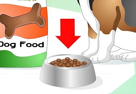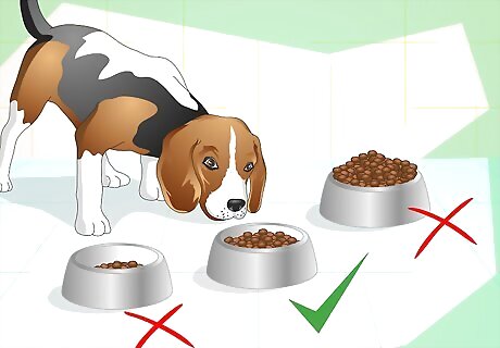 Feed him the right amount. In order to keep your dog in the right weight range, you need to feed him the recommended amounts every day. To help you do this, measure the amount of food with a measuring cup at each meal. This will ensure you don't overfeed or underfeed him. Look on the back of your dog's food to see the proper amount for him. This is typically based on weight, so make sure you know how much he ways so you can feed him the right amount. Overfeeding can lead to obesity, which is the largest nutritional issue facing dog’s today. If you follow the recommended amount of food, avoid feeding him more than a treat or two a day because it will increase his calorie intake.