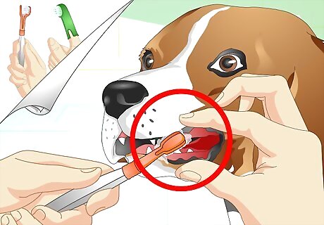Take care of his teeth. Your beagle will build up plaque on his teeth just like you do. This means you need to focus on his teeth, which can be done with dental formulated treats as well as brushing. Treats such as rawhides or dental treats help clean the plaque as your dog chews. In addition to these treats, brush his teeth every few days to once a week. Start by buying a dog toothbrush and toothpaste from the pet store or your vet. Never use human toothpaste because it is poisonous to dogs. Use a small amount of toothpaste on your finger to get him used to taste and you being in his mouth. Rub it along his gums, then work up to brushing his teeth. Work from the back to front on the outside of his teeth for about 30 seconds.