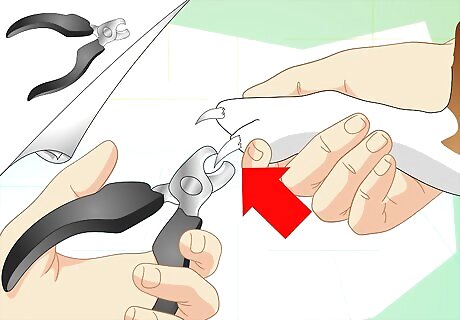 Trim his nails. Trimming your dog's nails is important to prevent accidental scratching and keep him happy. Start with the back nails, which are typically shorter and easier to handle. When you go to cut his nails, look for the quick, which you can see on the underside of the nails. These contain blood vessels and will bleed if you cut them. Move two to three millimeter from the quick, trimming from there. Do the same for each nail. The first time you do this, ask someone to help by holding your dog. He might jerk and cause you to hurt him. Make sure you buy a dog nail trimmer. Never use scissors or human nail trimmers. If you aren't sure how to do it yourself, ask your vet to show you. If your dog is older and arthritic, it may cause him pain when you cut his nails.
