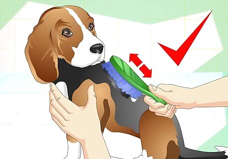 Brush your dog. Your beagle's coat may be short haired, but that doesn't mean he doesn't have to be brushed. He is prone to shedding, and brushing him regularly will help cut down on his shedding. Buy a short bristled brush to help remove loose fur and stimulate skin circulation and skin health. While you do this, also look for fleas, ticks, and other skin conditions or abnormality. If you find parasites on him, treat them as soon as you can. This includes his skin as well as bedding and your house.