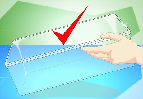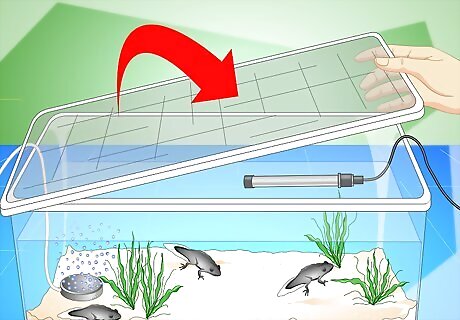 Put a lid on your tadpole tank. As your tadpoles develop limbs, they'll be at risk of making their way out of the tank. You'll want to prevent this from happening, both for the safety of your fledgling frogs and for your human habitat! The best lid will be well-ventilated, in order to let in fresh air while still keeping your frogs safely inside. A lid that attaches to the tank is best. Some commercial tanks come with snap-on lids, which work quite well.