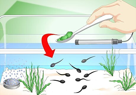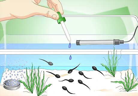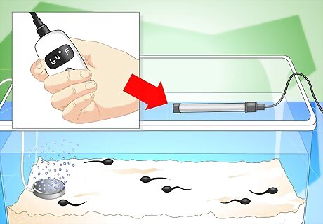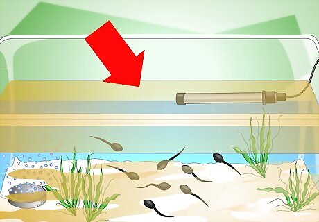 Keep water at an even temperature. The ideal temperature for common frog tadpoles is between 59° and 68° (15°C and 20°C). If your outdoor temperatures will make this difficult to maintain, you'll need to be able to keep your tadpole habitat inside. If the temperature rises above this, pollution can be a problem. To raise the temperature in your tadpole habitat, you may need to invest in an aquarium heater. Hanging heaters in glass tubes are the most common, but nonbreakable heaters in titanium or stainless steel can also be purchased. To lower your tank's temperature, try positioning a fan that blows air across the water's surface. This will also increase evaporation, so make sure that you're replacing the lost water as your water cools. You can also freeze water in plastic bottles and place these bottles inside your tadpole habitat. This functions as ice cools liquid in a glass.