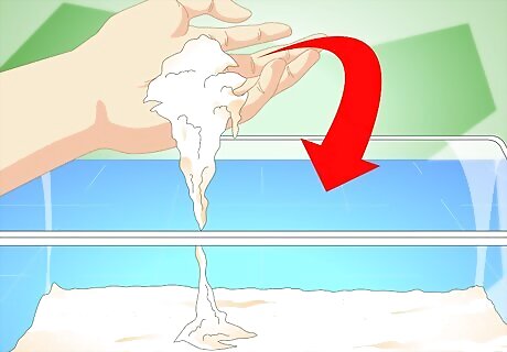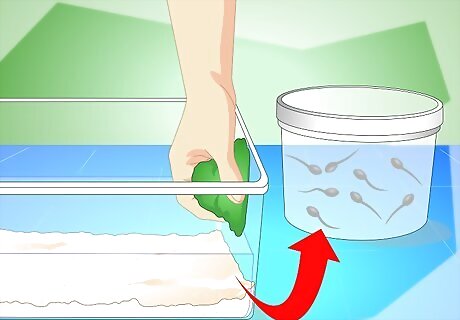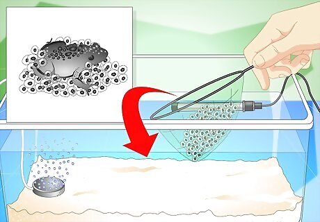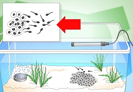 Collect frogspawn. You can easily capture all the frogspawn (frog eggs) you want to raise from a local pond, lake or stream. Bring a net or a bucket to this water source. When you arrive at the prepared habitat, use a small mesh net to collect and transfer the frogspawn. Make sure you can put the frogspawn directly into their new habitat. Raise the tadpoles separately from other aquatic animals. They should get their own habitat.