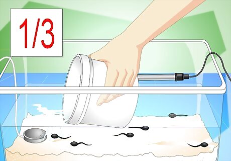 Clean your tank frequently. You'll know that the water needs changing if you notice a cloudy appearance or unpleasant odor to the water. Watch for tadpoles lingering near the surface or waste settling at the bottom of the tank. Make sure that any new water is the same temperature as the water already in the tank– drastic changes in water temperature can kill your tadpoles. To clean your tank, you will need to have a second location where you can keep the tadpoles while you clean the inside of their tank. If your water isn't very dirty, you can leave the tadpoles in their habitat, while removing about a third of the water. Never use commercial cleaning products, which may contain harmful chemicals A clean tank will help prevent your tadpoles from getting infected or diseased.