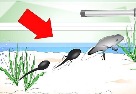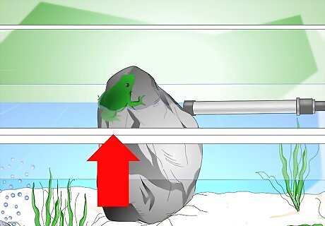 Put something the frogs can climb into the tank. While you want to make sure your new frogs don't get out of their tank, you'll also want them the opportunity to climb from the water and use their developing lungs to breathe air. A fat stick or a wide rock that rests on the base of the tank is a good choice. Once the frog starts to use its lungs to breathe, it's unable to use its gills. Without some way to climb out of the water, the frog may drown. Make sure the object is fixed, so that it can't move when the frog is on it.