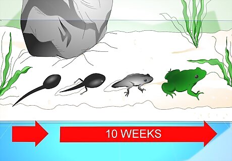 Watch for metamorphosis. The first signs of your tadpoles' development into a full-grown frog will be the front legs (or arms) starting to bud. Soon thereafter, the mouthparts completely change. The tadpoles' gills stop functioning and their lungs start to work, so that they can breathe air. The skin changes from a smooth and slimy skin to a rougher, porous skin which allows air and water through. Internally, the tadpoles' intestinal tracks will change from the long intestine of a plant eater to the short intestine of a protein eater, which will comprise most of an adult frog's diet. You'll see limbs containing a skeleton grow out of a body which had no limbs or bones, as the tail muscle and fin deteriorates and is reabsorbed by the body.
