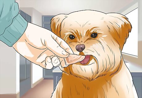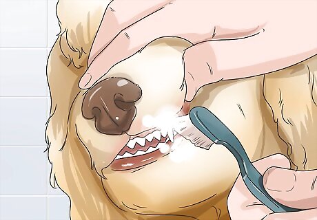 Brush your dog’s teeth. Take care of your dog’s teeth by getting into the habit of regular tooth brushing. Use a special dog toothbrush or a finger mitt. Wet the brush with water and gently rub it on the outer surfaces of the teeth. Once the dog is happy with this, you can introduce a blob of dog toothpaste onto the brush. You can do this once a week. These pastes are tasty to dogs, don't need rinsing and are free from substances harmful to dogs if swallowed, such as fluoride. Never give a dog human toothpaste.