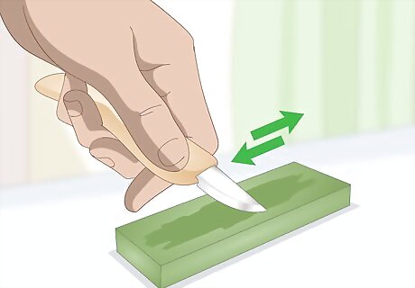 Sharpen your knife when it stops making clean cuts. Push the blade of the knife across the sharpening stone at a 10-20 degree angle. Bend your elbow slightly to keep the angle steady. Keep your wrist locked while you move the knife across the stone. Switch the knife between hands to sharpen both sides of the blade. Keeping your knife sharp is an important part of wood carving safety. It is much more likely that you will cut yourself with a dull knife than with a sharp one.