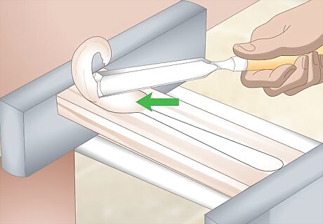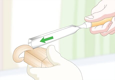 Use a gouge to create hollow areas or curves on your wood. Secure your piece to a work surface with clamps or a vice. Hold a gouge with an overhand grip in your non-dominant hand, place the curved blade against the wood, then push on the bottom of the handle with your dominant hand to gouge out pieces of wood. Gouges come in all different sizes and can be used to hollow out large, shallow areas, or to create small, fine details on your pieces.