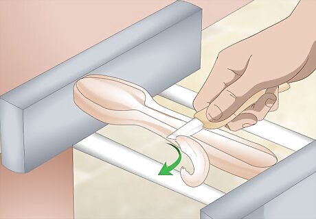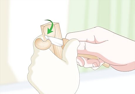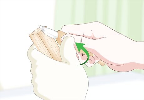 Wear a wood carving glove on the hand that holds the wood. Use a leather hide work glove or purchase a glove designed for wood carving. You just need 1 glove for your non-dominant hand. The hand that holds the knife, your dominant hand, will be glove-free. You can protect the thumb on your cutting hand with a leather thumb guard designed for wood carving.