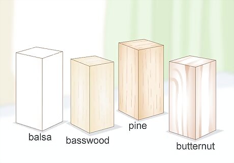 Start carving with softwoods like balsa, basswood, pine, or butternut. These are popular choices to begin wood carving because they are much easier to carve than hardwoods. Get basswood or balsa from a local craft shop, and buy pine or butternut at a lumber yard. Basswood and balsa are very soft, fine-grained woods that are the easiest for beginners to carve. Pine and butternut are more coarse-grained woods, but are still easy enough for beginners to carve. When you choose wood to carve, avoid pieces with knots or growth rings. These will be difficult to carve around.