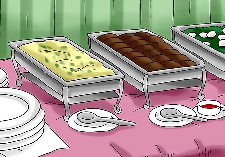 Decide on a serving style. If you’re catering your own wedding, keep in mind that your attention is going be pretty divided on the big day. Don’t plan on plating each individual guest’s meal yourself. Instead, go with a less labor-intensive method, like: Buffet style Cafeteria style Family style