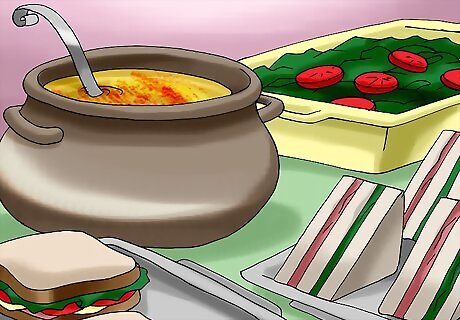Pad your menu out with room-temperature foods. Avoid the temptation to cook everything. Focus your cooking efforts on doing a couple of dishes really well instead of trying to take on too much at once. Balance out your menu (or even load it) with foods that can be served as is, at room temperature, without any real need of a kitchen, like sandwich meats, salads, and cold soups. This is an especially good idea if the reception site's kitchen facilities are limited, and/or you have few hands to help you out on the day of.