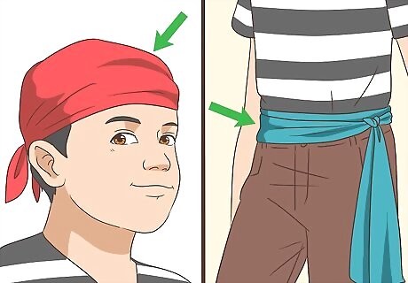 Get a head scarf and sash belt. Pirates often wore scarves on their heads to protect their heads from sunburn at sea. Use a regular bandanna and tie it around your head and in a knot at the back. Cut a piece of fabric long enough to tie around your waist to use as your sash belt. Tie your sash belt around your waist in a knot at your side.