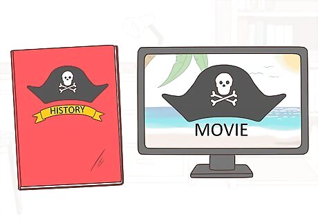 Read pirate books or watch pirate movies. Learn more about real pirates in history by going to the library and checking out books or movies about pirates. Some real pirates to learn about include Blackbeard, Calico Jack, Captain Kidd, and Sir Frances Drake. Share what you learn about pirates at school or with your friends as a bonus activity.