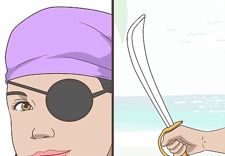 Find an eyepatch and plastic pirate sword. Complete your costume with an eye patch and fake sword. You can make your own eye patch out of black fabric or felt by cutting it into a circular shape and gluing a string at each side then tying the string around your head. Find a plastic pirate sword at a costume store or department store around Halloween.