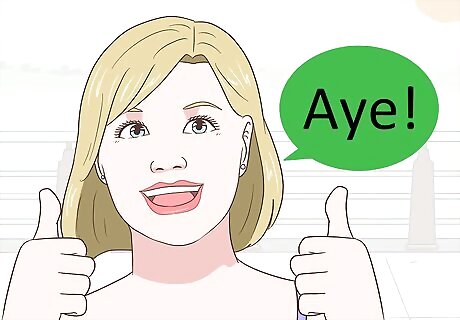 Agree with someone by saying “Aye!” The word “Aye,” pronounced “Eye,” is the pirate word for “Yes” or “Right.” Use this word in a conversation when you're agreeing with a person or saying yes to a question. For example, if someone asks you, “Do you want to go swimming?” answer “Aye!” If someone says, “It's windy on this beach,” and you agree with them, answer “Aye! It is.”