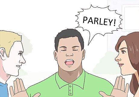 Settle a dispute by having a “parley.” Pirates had a code that they had to stop fighting and sort out their argument with talking if someone called for a “parley,” or conference or discussion. Often this discussion involved the ship captains, and the word stems from the French word “parler” for “to speak.” If your friends are arguing, yell, “Parley!” so they stop. Have everyone sit down and talk until the disagreement is settled.