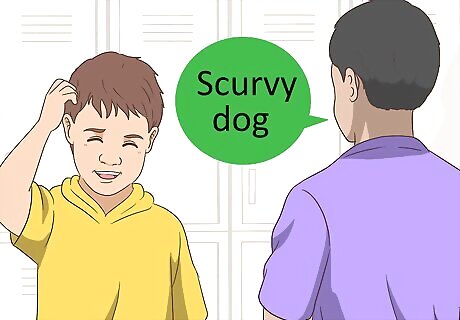 Call a friend who's being bad “scurvy dog.” Pirates referred to scoundrels or people who didn't follow the rules as “scurvy dogs,” which is basically a sick dog. Scurvy was an illness that sailors often got as a result of vitamin C deficiency. When your friend gets in trouble, say, “Why'd ye do that, scurvy dog?”