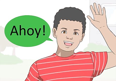Say “Ahoy!” to get someone's attention or hail transportation. A classic pirate word that essentially means “Hey!” is “Ahoy!” Use it when you're talking to a friend as a way to get their attention such as, “Ahoy, mate! How's it going?” You can also use this word to hail transportation; in pirate days, this was a ship, but you can use it to hail a taxi or bus. Wave your hand to the approaching vehicle and yell, “Ahoy!”