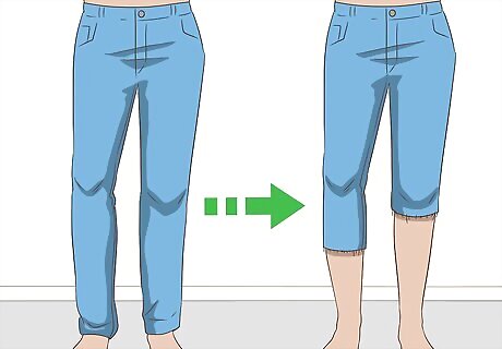Cut a pair of pants to make one leg longer than the other. Pirates often wore pants that were different lengths at the legs because of their rough lifestyles. You can cut a pair of your own pants with fabric scissors. Cut 1 pant leg to your mid-calf and cut the other so it falls at your knee. Don't hem your pants after cutting them; allow them to fringe at the bottom where you cut them.