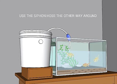 Use the siphon to put the water back into the tank. This is better than pouring it in because it won’t upset the fish or the decorations.