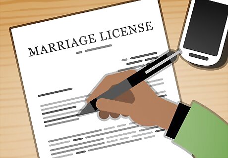 Fill out the marriage license. Once you've gotten your marriage license and are married, make sure the license is signed by an ordained or licensed officiant or justice of the peace. You, your spouse, and witnesses will all also need to sign the license. This is the first legal document you'll need to get in order to change your name, so keep any copies you're given after you initially submit your marriage license. In most counties, your officiant or justice of the peace will need to officially file the license with the county. At this point, you'll usually be given copies of the completed license.