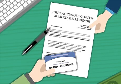 Get replacement copies of your marriage license. If you need a replacement certified copy, go to the county clerk's office where you picked up your marriage licence application and request a copy of the marriage license after your marriage. You can also get state certified copies of the license from the Bureau of Health Statistics. You'll need to show government-issued identification and can usually pick up the copy the next day. If you can't get the copy in person, call the Bureau of Health Statistics. You'll need to provide personal information and pay $33 as a processing fee and to verify your identity. You should get your copy in the mail within 2 weeks.