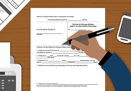 Fill out the petition for Change of Name form. You can find the form online or at the county clerk's office. Most counties will allow you to file the form online, but check to see if your county accepts e-filing. You'll need to provide basic information, including: Your current name Your description, including height, weight, hair and eye color, race, sex, place and date of birth Where you lived for the past five years Why you'd like to change your name A legal description of all real estate you own in Iowa or in which you have any legal interest The new name you want Your marital status You'll also need to attach the certified copy of your birth certificate when you file the form. If you don't have one, you can submit identification given by the U.S. Department of Immigration and Naturalization Service.