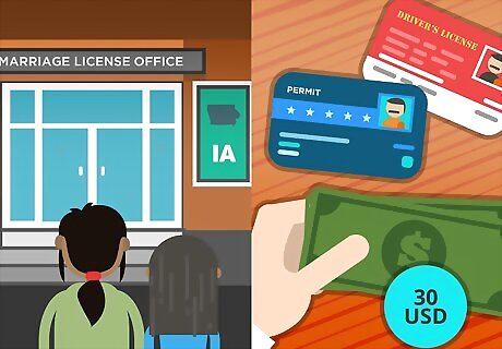 Get your marriage license. Find your local marriage license office through the county recorder. You'll need to apply for the marriage license in person before the marriage. Make sure you have 1 witness who's over 18 years old to come with you. To apply for your license, you'll need to: Be at least 18 years old Show picture identification Give social security information Pay $30 in cash Show date of divorce or spouse's death, if you were married before Wait 3 business days after applying before receiving your license