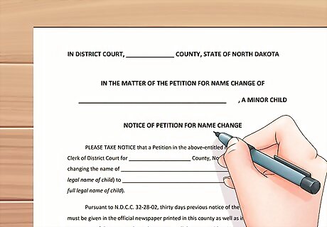Complete a Petition for Name Change. To get a court order officially changing your name, you must fill out a "Petition for Name Change." You can download the form here. The form is also available at the district court clerk's office. Leave the case number blank. You will not be issued a case number until you file your forms with the court clerk. You must wait until your Notice of Petition for Name Change has been published in a newspaper before you can complete section 5, unless you indicate that you are requesting that the judge waive the publication requirement.