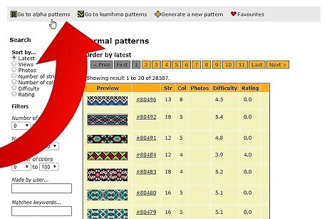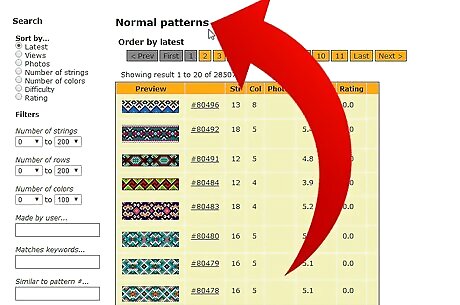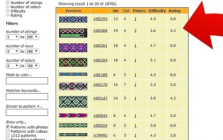 Click a bracelet pattern to learn more information about it. When you click on it, it will show you the pattern, how many rows it is (except Kumihimo bracelets), how many colours, the difficulty, etc. Near the bottom of the page, in the middle, it shows similar patterns to the one you are looking at and photos.Choose a Pattern on Friendship–Bracelets.net Step 7Bullet1.jpg