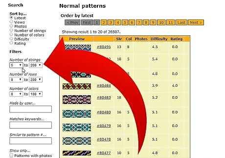 Choose how many strings and colours you want the bracelet to be. You can adjust this by looking at the left hand side. Click the "Patterns with Photos" button if you only want patterns with photos so you know what the bracelet will look like.Choose a Pattern on Friendship–Bracelets.net Step 5Bullet1.jpg