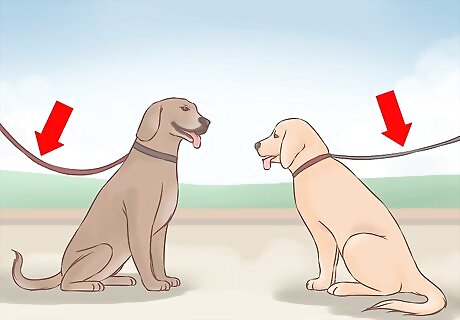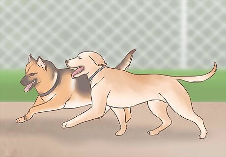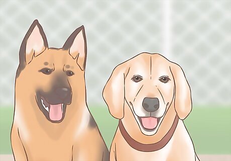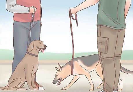 Schedule regular play dates before adoption. Ask friends or other dog owners if you can schedule regular play dates with your current dog and with the dog you are about to adopt. Exposing your new dog to many social and friendly dogs will help them get used to interacting in playful and kind ways. Try to meet in a dog park or another neutral location to minimize territorial reactions. Try scheduling weekly or bi-monthly playdates to slowly introduce your new dog to their new family and friends.