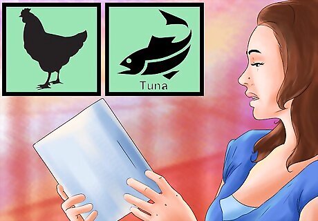 Check for meat proteins. Cats are obligate carnivores and they need meat-based protein to thrive. Check the ingredients list on cat food to confirm the first ingredient is a meat like chicken, tuna, beef, or turkey. Good cat food will list a specific meat as the first ingredient, rather than 'meat by-products' or 'poultry'.. If the label just says “meat” or “meat by-product,” it may not be very high quality. Make sure the type of animal protein is specified on the label.