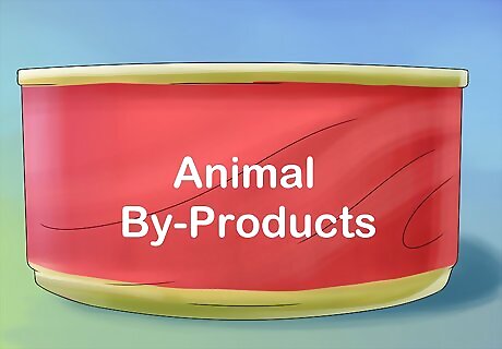 Check for by-products. Most cat foods will contain animal by-products. If the food is high quality, it may contain animal by-products like liver, and lungs. These are fine for cats to consume. Lower-quality foods may have animal by-products (such as fur or feathers) that are hard for cats to digest. Avoid lower-quality cat foods with lots of unspecified by-products. By-products should appear before the list of grains, plant matter, vitamins, and minerals. They are highly nutritious and come with great benefits. Some cat food brands will list the by-products, such as "animal liver or lungs" while other brands may just say "animal by-products." Try to pick a food that specifies the by-product.