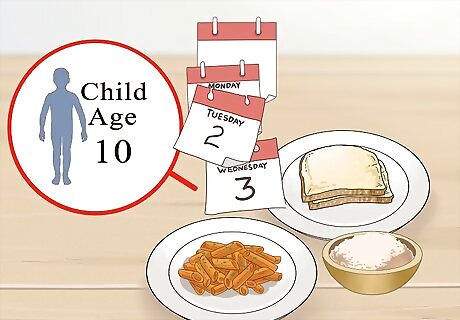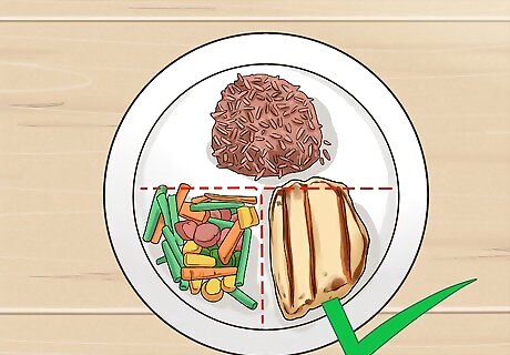Prepare meals with healthy proportions. Do your best to serve meals that are not only well portioned, but that have the healthiest proportions of each food group. In general, half of each meal should consist of fruits or veggies, a quarter should be grains, and the last quarter should be lean protein. For example, a well-proportioned lunch for a ten year old could be a baseball-sized serving of mixed greens, a piece of grilled chicken breast the size of a deck of cards, and a serving of brown rice half the size of a baseball.