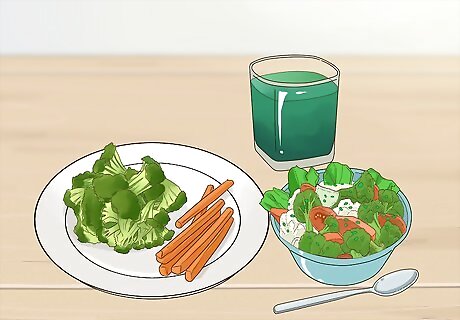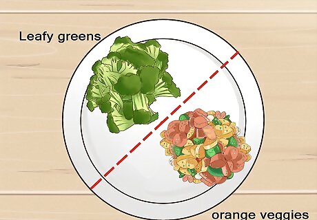 Make sure you child eats their veggies. Younger children (ages 2 to 6) need three servings of vegetables per day and older children (ages 7 and up) need four servings of vegetables per day. Try to mix up the veggies you serve by color and kind. In other words, try to serve a combination of leafy greens (lettuce, kale, or broccoli), orange veggies (carrots, peppers, or squash), and legumes (beans or peas). You and your family don't have to have all the veggie groups every day, but try to have at least of portion of each every week. A day's worth of veggies by portion size could be: 3/4 cup (180 mL) of vegetable juice (like tomato juice) with breakfast, a baseball-sized portion of mixed green salad or carrot sticks with lunch, and a baseball-sized amount of squash or medium-sized sweet potato with dinner.