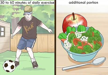 Adapt portion sizes based on your child's activity level. Guidelines for portion sizes are generally designed for kids that get the recommended 30 to 60 minutes of daily exercise. If your child plays a sport or is more active, they will need an additional portion or two of each food group, depending on their age, sex, and level of activity. Their pediatrician can help you determine the best amount of each food group. Keep in mind that feeding them more meals and snacks in between meals, rather than one or two larger meals, is better for their metabolism and energy level.