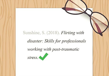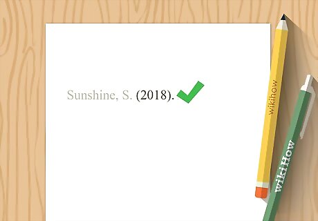 Add the year of publication in parentheses. Even if a more specific date is given, APA style only requires you to include the year a report was published. Type a space after the period following the author's name, then type the year in parentheses. Place a period after the closing parentheses. Individual author example: Sunshine, S. (2018). Group author example: Ontario Ministry of Health. (1994).