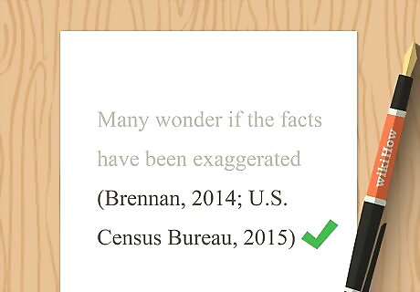 Separate multiple works in the same parenthetical with semi-colons. Some sentences in your paper may include paraphrases of facts or information that come from more than one source. In the parenthetical citation at the end of the sentence, include the author and year for each source, separated by a semi-colon. Example: (Brennan, 2014; U.S. Census Bureau, 2015)