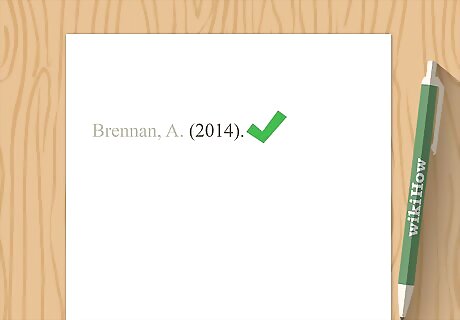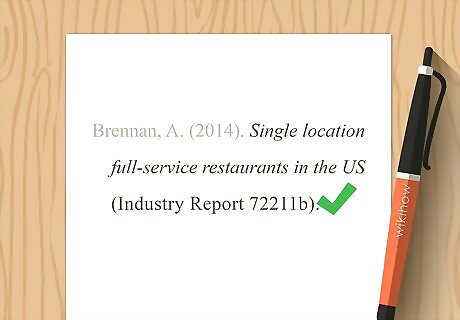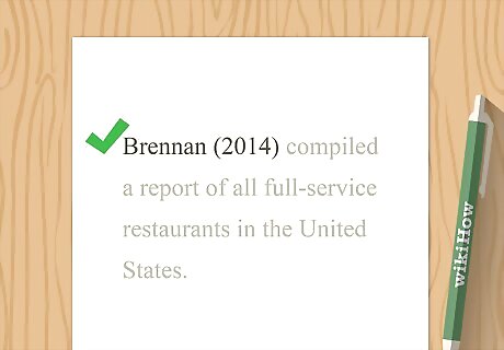 Place the year in parentheses when mentioning the author in text. If you mention the author of the report in your sentence, there's no need to repeat the author's name in your parenthetical citation. Instead, place the year of publication in parentheses immediately after the author's name. Example: Brennan (2014) compiled a report of all full-service restaurants in the United States.