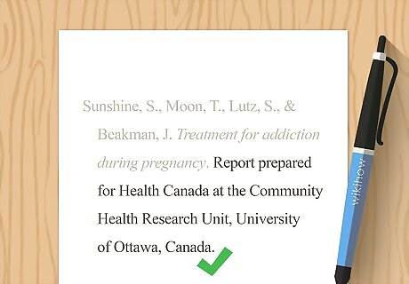 List the name of the author first. Some reports credit an individual person as the author, while others are credited solely to the organization or governmental agency that produced it. For your reference list citation, copy the author exactly as listed on the report. Individual names should be listed last name first, then a comma, then the person's initial. Place a period after the name of the author. Individual author example: Sunshine, S. Group author example: Ontario Ministry of Health. If there are multiple writers, separate their names with commas. Use an ampersand before the last writer's name. For example: Sunshine, S., Moon, T., Lutz, S., & Beakman, J. Include the name of the higher governmental department if the specific agency isn't well known (Example: U.S. Food and Drug Administration, Center for Drug Evaluation and Research). Use your best judgment on this, or ask your instructor or supervisor. When in doubt, err on the side of too much rather than too little information.