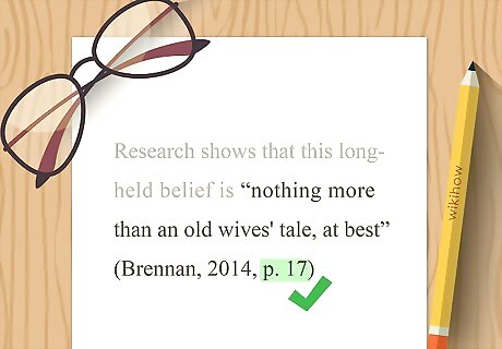 Add the page number when quoting directly from the source. For direct quotes in your text, place a comma after the year in your parenthetical citation. Use the abbreviation "p." and type the page number where the quote can be found. If the quote crosses 2 pages, use the abbreviation "pp." followed by the page numbers, separated by a hyphen. Example: (Brennan, 2014, p. 17)