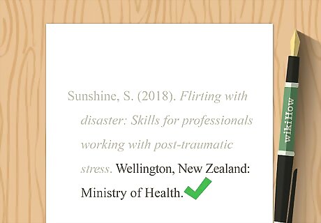 Indicate the location and name of the publisher. Provide the city and state for US locations. For all other locations, provide the city and country. Write out the name of the country rather than using an abbreviation. Place a colon after the location, then type the name of the publisher. If the report has a group author that was also the publisher, type the word "Author" in place of the publisher. Place a period after the publisher's name to close out your citation. Individual author example: Sunshine, S. (2018). Flirting with disaster: Skills for professionals working with post-traumatic stress. Wellington, New Zealand: Ministry of Health. Group author example: Ontario Ministry of Health. (1994). Selected findings from the mental health supplement of the Ontario Health Survey. Ottawa, Canada: Author.