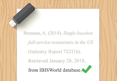 Copy the URL or database name where the report can be found. The final portion of your citation tells your readers exactly where they can find the report you used in your research. Write "Retrieved from" first. If the report is freely available online, provide the URL. Since most databases do not provide a direct permalink and require a subscription to access, simply identify the database by name. Place a period at the end to close your citation. Individual author example: Brennan, A. (2014). Single location full-service restaurants in the US (Industry Report 72211b). Retrieved from IBISWorld database. Group author example: U.S. Census Bureau. (2015). State & county quick facts: Berks County, Pennsylvania. Retrieved from http://quickfacts.census.gov/qfd/states/42/42011.html.