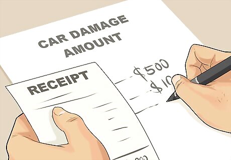Get an estimate for car damage. You can also be compensated for any damage to your car if you were not at fault. Accordingly, you should get an estimate for the amount of damage caused. If you must have your car repaired, then save all receipts that list the cost of repairs. Lawsuits can take up to 2 years to resolve, so don’t hold off on repairing your car before the conclusion of the suit. You can use the amounts paid to fix the car as your estimate of damages.