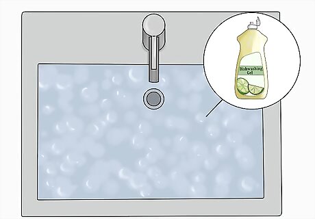 Fill your sink with boiling water and dish soap. Plug your kitchen drain so that water gathers in the sink and fill it with super hot water. Squirt dish soap into the water and stir it around, creating soapy water. Use a mild dish soap that you would use for your regular dishes. Alternatively you could place the filter in the dishwasher.