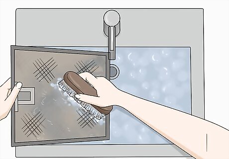 Scrub the filter to remove any leftover grease and grime. Use a soft cloth to rub off grease or dirt that’s stuck on the metal or sponge filter. Rinse the filter with clean water to remove any dirty remnants. Use a non-abrasive cloth or cleaning tool to scrub the filter.